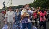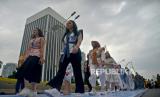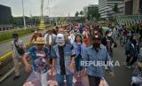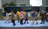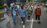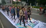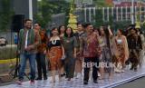 Sejumlah peserta mengikuti fashion show Batik on the Street saat pelaksanaan Hari Bebas Kendaraan Bermotor (HBKB) di Jalan Jenderal Sudirman, Jakarta, Ahad (2/10/2022). Kegiatan yang turut didukung oleh Kementerian Perindustrian tersebut digelar sebagai rangkaian Hari Batik Nasional dan HUT Bank Mandiri ke-24. (FOTO : Republika/Prayogi)