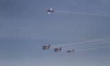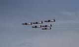 REPUBLIKA.CO.ID,JAKARTA -- Tim Jupiter Aerobatic melakukan flypast saat gladi bersih HUT TNI AU di Lanud Halim Perdanakusuma, Jakarta, Senin (3/10/2022).