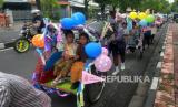 Puluhan becak kayuh yang dihias digunakan oleh pelajar SD untuk karnaval menyambut HUT ke-266 Kota Yogyakarta. HUT Kota Yogyakarta diperingati setiap 7 Oktober.
