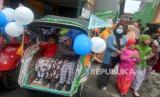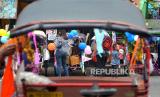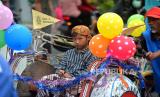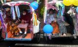 Siswa sekolah dasar negeri (SDN) Badran menggunakan pakaian Gagrak Ngayogyakarta saat karnaval di Yogyakarta, Senin (3/10/2022). Puluhan becak kayuh yang dihias digunakan oleh pelajar SD untuk karnaval menyambut HUT ke-266 Kota Yogyakarta. HUT Kota Yogyakarta diperingati setiap 7 Oktober. (FOTO : Republika/Wihdan Hidayat)