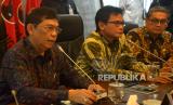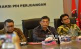 Ketua Fraksi PDI Perjuangan DPR RI Utut Adianto (kiri) memberikan keterangan bersama dengan Anggota DPR Fraksi PDI Perjuangan Johan Budi (tengah) dan Putra Nababan (kanan) terkait insiden Kanjuruhan di Ruang Fraksi PDIP, Kompleks Parlemen, Senayan, Jakarta, Senin (3/10/2022). Fraksi PDIP DPR RI meminta Kapolri hingga PSSI mengevaluasi secara tuntas insiden di Stadion Kanjuruhan yang mengakibatkan ratusan orang meninggal dunia, Sebab insiden ini meninggalkan duka yang amat mendalam dan menjadi lembaran hitam dalam olahraga nasional. Prayogi/Republika. (FOTO : Prayogi/Republika.)