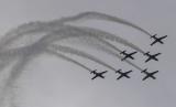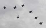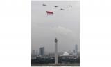 REPUBLIKA.CO.ID,JAKARTA -- Pesawat tempur F-16 mengeluarkan flare saat flypast perayaan HUT ke-77 TNI di Langit Monas, Jakarta, Rabu (5/10/2022).