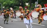 Anggota Drumband Canka Panorama Secapa AD?tampil jelang Upacara HUT ke-77 TNI di depan Istana Merdeka, Jakarta, Rabu (5/10/2022). Peringatan HUT ke-77 TNI mengusung tema (FOTO : ANTARA/Hafidz Mubarak A)