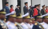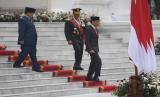 REPUBLIKA.CO.ID,JAKARTA -- Presiden Joko Widodo (tengah) didampingi Panglima TNI Jenderal TNI Andika Perkasa (kiri) dan Menteri Pertahanan Prabowo Subianto (kedua kiri) memimpin upacara peringatan HUT Ke-77 TNI di halaman Istana Merdeka, Jakarta, Rabu (5/10/2022).