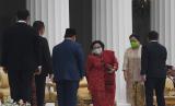 Presiden kelima RI Megawati Soekarnoputri (kiri) didampingi Ketua DPR Puan Maharani (kanan) tiba di lokasi upacara peringatan HUT ke-77 TNI di halaman Istana Merdeka, Jakarta, Rabu (5/10/2022). Peringatan HUT TNI di Istana dimeriahkan oleh pertunjukan pesawat tempur, pameran alutsista dan defile pasukan. (FOTO : ANTARA/Akbar Nugroho Gumay)