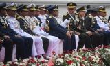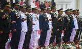 Sejumlah perwira tinggi TNI mengikuti upacara peringatan HUT ke-77 TNI di halaman Istana Merdeka, Jakarta, Rabu (5/10/2022). Peringatan HUT TNI di Istana dimeriahkan oleh pertunjukan pesawat tempur, pameran alutsista dan defile pasukan. (FOTO : ANTARA/Akbar Nugroho Gumay)