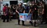 Petugas membawa barang bukti kasus pembunuhan berencana Brigadir J saat pelimpahan perkara di Kejakasaan Agung, Jakarta, Rabu (5/10/2022). Penyidik Bareskrim Polri menyerahkan 11 tersangka dan barang bukti kepada Kejaksaan Agung dalam pelimpahan tahap dua perkara pembunuhan berencana Brigadir J dan penghalangan penyidikan yang menjerat Mantan Kadiv Propam Polri Irjen Ferdy Sambo dan istirnya Putri Candrawathi. (FOTO : Republika/Thoudy Badai)