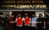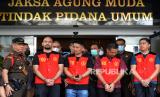 Tersangka kasus penghalangan penyidikan pembunuhan berencana Brigadir J, Kompol Baiquni Wibowow (kedua kiri) Kompol Chuck Putranto (tengah), AKP Irfan Widyanto (kedua kanan) dan AKBP Arif Rahman Arifin (kanan) diperlihatkan kepada awak media saat pelimpahan perkara di Kejakasaan Agung, Jakarta, Rabu (5/10/2022). Penyidik Bareskrim Polri menyerahkan 11 tersangka dan barang bukti kepada Kejaksaan Agung dalam pelimpahan tahap dua perkara pembunuhan berencana Brigadir J dan penghalangan penyidikan yang menjerat Mantan Kadiv Propam Polri Irjen Ferdy Sambo dan istirnya Putri Candrawathi. (FOTO : Republika/Thoudy Badai)