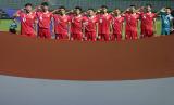 Sejumlah pesepak bola Timnas U-17 Indonesia melakukan sikap hormat ke bendera Merah Putih saat lagu Indonesia Raya berkumandang sebelum pertandingan melawan Timnas U-17 Uni Emirat Arab dalam laga Grup B Kualifikasi Piala Asia U-17 2023 di Stadion Pakansari, Kabupaten Bogor, Jawa Barat, Rabu (5/10/2022). (FOTO : ANTARA/Yulius Satria Wijaya)