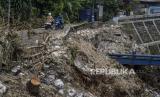 Retakan jalan yang ambles di Jalan Kerja Bakti VII, Makasar, Jakarta, Kamis (6/10/2022). Jalan ambles serta tebing longsor yang diakibatkan hujan deras itu membuat jalan tersebut tidak bisa dilewati oleh kendaraan roda empat sehingga mengganggu akses warga. (FOTO : Republika/Putra M. Akbar)