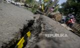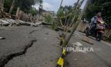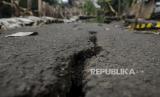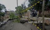 Retakan jalan yang ambles di Jalan Kerja Bakti VII, Makasar, Jakarta, Kamis (6/10/2022). Jalan ambles serta tebing longsor yang diakibatkan hujan deras itu membuat jalan tersebut tidak bisa dilewati oleh kendaraan roda empat sehingga mengganggu akses warga. Republika/Putra M. Akbar (FOTO : Republika/Putra M. Akbar)