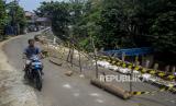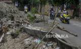 REPUBLIKA.CO.ID,JAKARTA -- Pengendara motor melintas di dekat jalan yang ambles akibat longsor di Jalan Kerja Bakti VII, Makasar, Jakarta, Kamis (6/10/2022).