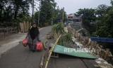 Warga melintas di dekat jalan yang ambles akibat longsor di Jalan Kerja Bakti VII, Makasar, Jakarta, Kamis (6/10/2022). Jalan ambles serta tebing longsor yang diakibatkan hujan deras itu membuat jalan tersebut tidak bisa dilewati oleh kendaraan roda empat sehingga mengganggu akses warga. Republika/Putra M. Akbar (FOTO : Republika/Putra M. Akbar)
