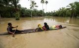 Warga melewati banjir dengan menggunakan perahu di Desa Mesjid Pirak, Kecamatan Matang Kuli, Aceh Utara, Aceh, Jumat (7/10/2022). Badan Penanggulangan Bencana Daerah (BPBD) menyebutkan banjir yang sebelumnya melanda 12 kecamatan meluas ke 14 kecamatan di Aceh Utara menyusul hujan intensitas sedang hingga lebat terus terjadi ditambah air kiriman dari wilayah hulu Takengon, Aceh Tengah dan Kabupaten Bener Meriah, sebanyak 38 ribu lebih warga mengungsi. (FOTO : ANTARA/Rahmad)
