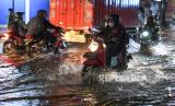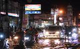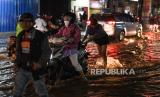 REPUBLIKA.CO.ID, DEPOK -- Pengendara melintasi Jalan Sawangan yang tergenang akibat luapan Kali Licin di Mampang, Depok, Jawa Barat, Jumat (7/10/2022). Banjir yang sering terjadi akibat penyempitan sungai di kawasan tersebut menyebabkan kemacetan panjang imbas tertutupnya akses jalan raya.