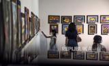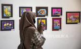 REPUBLIKA.CO.ID, BANDUNG -- Pengunjung melihat lukisan hasil karya anak-anak yang dipamerkan pada Festival Seni Tahunan ke-8 Rosa Art Center di Gedung Indonesia Menggugat, Jalan Perintis Kemerdekaan, Kota Bandung, Ahad (9/10/2022).