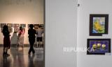 Pengunjung melihat lukisan hasil karya anak-anak yang dipamerkan pada Festival Seni Tahunan ke-8 Rosa Art Center di Gedung Indonesia Menggugat, Jalan Perintis Kemerdekaan, Kota Bandung, Ahad (9/10/2022). Pameran lukisan tahunan yang diikuti oleh sedikitnya 220 anak tersebut bertujuan untuk memberikan motivasi serta ruang berkreativitas dan mendorong perkembangan artistik anak melalui medium seni. (FOTO : REPUBLIKA/ABDAN SYAKURA)
