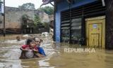 Anak-anak berjalan melewati banjir di kawasan Rawajati, Jakarta, Senin (10/10/2022). Tingginya curah hujan di Bogor Jawa Barat, mengakibatkan aliran sungai Ciliwung meluap hingga membuat ratusan rumah dari enam RT, kelurahan Rawajati terendam banjir dengan ketinggian dari 30 sentimeter hingga dua meter. (FOTO : Republika/Putra M. Akbar)