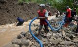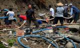 Warga bergotong-royong menyingkirkan material longsoran yang menutupi Sungai Kedung Jaha di Wadasmalang, Karangsambung, Kebumen, Jawa Tengah, Senin (10/10/2022). Warga menyingkirkan material menggunakan pompa air dan cangkul karena tidak ada akses untuk alat berat. Imbas longsor pada Sabtu (8/10/2022) malam satu warga Lansia meninggal, satu rumah tertimbun dan empat rumah rusak. (FOTO : Republika/Wihdan Hidayat)