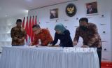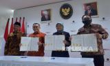 Menteri Pendayagunaan Aparatur Negara dan Reformasi Birokrasi (PANRB) Abdullah Azwar Anas (dua kiri), Menteri Ketenagakerjaan Ida Fauziyah (dua kanan) dan Menteri Agama Yaqut Cholil Qoumas (kanan) melakukan Penandatanganan Surat Keputusan Bersama (SKB) Libur Nasional dan Cuti Bersama 2023 disaksikan Menteri Koordinator Bidang Pembangunan Manusia dan Kebudayaan Muhadjir Effendy (kiri) di Kantor Kemenko PMK, Jakarta, Selasa (11/10/2022). Pemerintah resmi menetapkan hari libur nasional dan cuti bersama tahun 2023 sebanyak 24 hari, yang terdiri dari libur nasional sebanyak 16 hari dan cuti bersama sebanyak 8 hari. (FOTO : Republika/Prayogi)