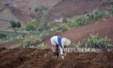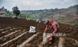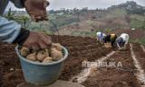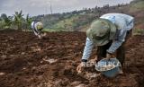 Petani menanam benih kentang di lahan pertanian di kawasan Cimenyan, Kabupaten Bandung, Selasa (11/10/2022). Petani kentang di kawasan tersebut mengeluhkan rendahnya harga jual hasil pertanian dan naiknya biaya produksi akibat kelangkaan stok pupuk serta harga pupuk yang mahal. Kelangkaan serta mahalnya harga pupuk tersebut dikarenakan komoditas pertanian kentang tidak termasuk dalam sembilan komoditas pertanian yang mendapat pupuk bersubsidi. (FOTO : REPUBLIKA/ABDAN SYAKURA)