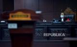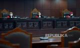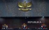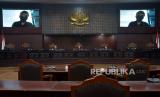 Suasana jalannya sidang uji Undang-Undang Nomor 7 Tahun 2017 tentang Pemilihan Umum di Gedung Mahkamah Konsitusi, Jakarta, Selasa (11/10/2022). Sidang tersebut beragendakan pemeriksaan pendahuluan dengan pemohon yaitu Leonardo Siahaan. (FOTO : Republika/Prayogi)