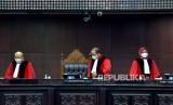 Hakim Konstitusi Suhartoyo (tengah) didampingi Hakim Konstitusi Enny Nurbaningsih (kanan) dan Hakim Konstitusi Wahiduddin Adams (kiri) bersiap memimpin jalannya sidang uji Undang-Undang Nomor 7 Tahun 2017 tentang Pemilihan Umum di Gedung Mahkamah Konsitusi, Jakarta, Selasa (11/10/2022). Sidang tersebut beragendakan pemeriksaan pendahuluan dengan pemohon yaitu Leonardo Siahaan.Prayogi/Republika. (FOTO : Republika/Prayogi)