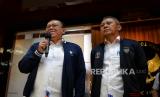 Direktur Utama PT Liga Indonesia Baru (LIB) Akhmad Hadian Lukita (kiri) didampingi Direktur Operasional PT LIB, Sudjarno (kanan) menyampaikan keterangan kepada awak media seusai memenuhi panggilan Tim Gabungan Independen Pencari Fakta (TGIPF) untuk dimintai klarifikasi di Gedung Kemenko Polhukam, Jakarta, Selasa (11/10/2022). Dalam keterangannya, Akhmad Hadian Lukita menegaskan akan bertanggung jawab atas tragedi Kanjuruhan yang menewaskan sebanyak 132 orang. Republika/Thoudy Badai (FOTO : Republika/Thoudy Badai)