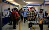 Pencari kerja mengantre untuk mengunjungi stan sejumlah perusahaan saat kegiatan Jakarta Job Fair di Pusat Grosir Cililitan (PGC), Jakarta, Rabu (12/10/2022). Sebanyak 5.000 lowongan pekerjaan dari 40 perusahaan ditawarkan dalam bursa kerja tersebut sebagai upaya penyerapan angka kerja dalam mengatasi pengangguran. Bursa kerja tersebut belangsung selama 2 hari dari tanggal 11-12 Oktober 2022 dengan jumlah pendaftar hingga 8.000 peserta. (FOTO : Republika/Thoudy Badai)