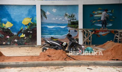 Pekerja menggambar mural bertemakan laut saat menyelesaikan pembangunan proyek lokasi wisata pantai di Pelabuhan Lama Sibolga, Sumatera Utara, Rabu (12/10/2022). Pembangunan proyek lokasi wisata tersebut saat ini telah mencapai 85 persen dan ditargetkan akan selesai pada bulan Desember mendatang. (FOTO : ANTARA/Fransisco Carolio)
