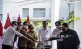 Presiden Joko Widodo (ketiga kanan) bersama Menteri BUMN Erick Thohir (kanan), Menko Marves Luhut Binsar Pandjaitan (kedua kanan), Direkur Utama PT Bio Farma Honesti Basyir (tengah), Menteri Kesehatan Budi Gunadi Sadikin (ketiga kiri), Menteri Perhubungan Budi Karya Sumadi (kiri) dan Gubernur Jawa Barat Ridwan Kamil (kedua kiri) menekan tombol saat Peluncuran Vaksin IndoVac di PT Bio Farma (Persero), Jalan Pasteur, Kota Bandung, Kamis (13/10/2022). Presiden Joko Widodo secara resmi meluncurkan vaksin Covid-19 bernama IndoVac yang diproduksi oleh PT Bio Farma (Persero). Vaksin IndoVac tersebut mulai diproduksi secara massal pada Kamis (13/10/2022) dengan target mencapai 20 juta dosis dan akan meningkat 40 juta dosis pada tahun 2023. Republika/Abdan Syakura (FOTO : REPUBLIKA/ABDAN SYAKURA)