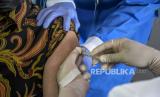 Petugas kesehatan menyuntikkan vaksin IndoVac ke warga di PT Bio Farma (Persero), Jalan Pasteur, Kota Bandung, Kamis (13/10/2022). Sebanyak 15 orang menjalani penyuntikan perdana vaksin IndoVac produksi PT Bio Farma (Persero). Vaksin IndoVac tersebut telah mendapatkan emergency use authorization (EUA) dari Badan Pengawas Obat dan Makanan (BPOM) dan siap digunakan untuk vaksin primer bagi masyarakat. (FOTO : REPUBLIKA/ABDAN SYAKURA)