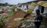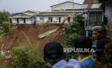 Warga melihat lokasi longsor di Kampung Kebon Jahe, Kebon Kelapa, Kota Bogor, Jawa Barat, Kamis (13/10/2022). Bencana tanah longsor yang diakibatkan hujan deras pada Rabu ((12/10/2022) sore tersebut mengakibatkan satu orang meninggal dunia dan tiga warga lainnya masih dalam proses pencarian. Republika/Putra M. Akbar (FOTO : Republika/Putra M. Akbar)