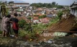 Warga melihat lokasi longsor di Kampung Kebon Jahe, Kebon Kelapa, Kota Bogor, Jawa Barat, Kamis (13/10/2022). Bencana tanah longsor yang diakibatkan hujan deras pada Rabu (12/10/2022) sore tersebut mengakibatkan satu orang meninggal dunia dan tiga warga lainnya masih dalam proses pencarian. Republika/Putra M. Akbar (FOTO : Republika/Putra M. Akbar)