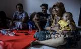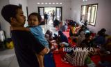 Warga terdampak bencana longsor menggendong anaknya saat mengungsi di Masjid Jami Nurul Ikhlas, Kota Bogor, Jawa Barat, Kamis (13/10/2022). Ratusan warga terdampak bencana longsor di Kampung Kebon Jahe diungsikan sementara di masjid tersebut untuk mengantisipasi terjadinya longsor susulan. Republika/Putra M. Akbar (FOTO : Republika/Putra M. Akbar)