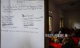 Catatan kronologis peristiwa yang terpasang di posko pengungsian di Masjid Jami Nurul Ikhlas, Kota Bogor, Jawa Barat, Kamis (13/10/2022). Ratusan warga terdampak bencana longsor di Kampung Kebon Jahe diungsikan sementara di masjid tersebut untuk mengantisipasi terjadinya longsor susulan. Republika/Putra M. Akbar (FOTO : Republika/Putra M. Akbar)