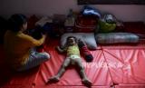 Warga terdampak bencana longsor sberistirahat di posko pengungsian di Masjid Jami Nurul Ikhlas, Kota Bogor, Jawa Barat, Kamis (13/10/2022). Ratusan warga terdampak bencana longsor di Kampung Kebon Jahe diungsikan sementara di masjid tersebut untuk mengantisipasi terjadinya longsor susulan. (FOTO : Republika/Putra M. Akbar)