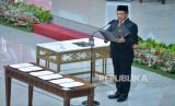 Penjabat (Pj) Gubernur DKI Jakarta Heru Budi Hartono mengucapkan sumpah jabatan dalam acara pelantikan di Kementerian Dalam Negeri, Jakarta, Senin (17/10/2022). Dalam acara tersebut Heru Budi Hartono sah dilantik sebagai Penjabat (Pj) Gubernur DKI Jakarta menggantikan Anies Baswedan dan Ahmad Riza Patria yang purnatugas. Prayogi/Republika. (FOTO : Republika/Prayogi)
