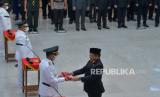Menteri Dalam Negeri Tito Karnavian melantik Penjabat (Pj) Gubernur DKI Jakarta Heru Budi Hartono di Kementerian Dalam Negeri, Jakarta, Senin (17/10/2022). Heru Budi Hartono sah dilantik sebagai Penjabat (Pj) Gubernur DKI Jakarta menggantikan Anies Baswedan dan Ahmad Riza Patria yang purnatugas. Prayogi/Republika. (FOTO : Republika/Prayogi)
