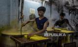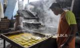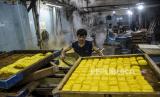 Pekerja menyelesaikan pembuatan tahu di salah satu industri tahu rumahan di Jalan Aki Padma, Babakan Ciparay, Kota Bandung, Senin (17/10/2022). Berdasarkan keterangan pengusaha tahu dan tempe di kawasan tersebut, akibat tingginya harga kedelai yang mencapai Rp12.800 hingga Rp14.000 per kilogram membuat mereka menaikkan harga tahu menjadi Rp60 ribu per papan serta harga tempe menjadi Rp13 ribu per kilogram. (FOTO : REPUBLIKA/ABDAN SYAKURA)