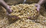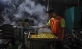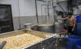 Pekerja mengolah kedelai untuk dijadikan tempe di salah satu industri tempe rumahan di Jalan Aki Padma, Babakan Ciparay, Kota Bandung, Senin (17/10/2022). Berdasarkan keterangan pengusaha tahu dan tempe di kawasan tersebut, akibat tingginya harga kedelai yang mencapai Rp12.800 hingga Rp14.000 per kilogram membuat mereka menaikkan harga tahu menjadi Rp60 ribu per papan serta harga tempe menjadi Rp13 ribu per kilogram. Republika/Abdan Syakura (FOTO : REPUBLIKA/ABDAN SYAKURA)