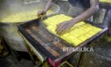 Pekerja mengemas tahu di salah satu industri tahu rumahan di Jalan Aki Padma, Babakan Ciparay, Kota Bandung, Senin (17/10/2022). Berdasarkan keterangan pengusaha tahu dan tempe di kawasan tersebut, akibat tingginya harga kedelai yang mencapai Rp12.800 hingga Rp14.000 per kilogram membuat mereka menaikkan harga tahu menjadi Rp60 ribu per papan serta harga tempe menjadi Rp13 ribu per kilogram. Republika/Abdan Syakura (FOTO : REPUBLIKA/ABDAN SYAKURA)