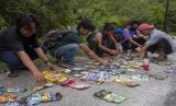 Sejumlah aktivis lingkungan mengidentifikasi sampel merek sampah kemasan plastik yang menimbun kawasan konservasi mangrove di Kelurahan Kabonga Besar, Donggala, Sulawesi Tengah, Ahad (16/10/2022). Identifikasi yang diinisiasi Seangle Indonesia Palu dan Mangrovers Teluk Palu itu untuk mengetahui spesifikasi sampah plastik khususnya kemasan menyusul telah tercemarnya teluk itu dengan sampah plastik baik jenis makro, meso, maupun mikroplastik. (FOTO : ANTARA/Basri Marzuki)
