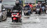 Pengendara kendaraan bermotor melintasi Jalan Raya Kutabumi yang tergenang banjir di Pasar Kemis, Kabupaten Tangerang, Banten, Senin (17/10/2022). Hujan deras serta buruknya sistem drainase di kawasan tersebut menyebabkan jalan raya tergenang banjir hingga 60 cm dan berimbas kepada kemacetan. (FOTO : ANTARA/Fauzan)