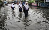 Sejumlah pelajar melintasi Jalan Raya Kutabumi yang tergenang banjir di Pasar Kemis, Kabupaten Tangerang, Banten, Senin (17/10/2022). Hujan deras serta buruknya sistem drainase di kawasan tersebut menyebabkan jalan raya tergenang banjir hingga 60 cm dan berimbas kepada kemacetan. (FOTO : ANTARA/Fauzan)