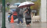 Warga menggunakan payung menembus hujan di kawasan Tugu Pal Putih, Yogyakarta, Senin (17/10/2022). BMKG Yogyakarta mengingatkan cuaca ekstrim yang terjadi di Yogyakarta. Potensi terjadi Hujan Sedang-Lebat yang dapat disertai kilat atau petir dan angin kencang akan terjadi dan menghimbau masyarakat mewaspadai cuaca ekstrim ini. (FOTO : Republika/Wihdan Hidayat)