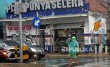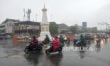 Warga menggunakan jas hujan menembus hujan di kawasan Tugu Pal Putih, Yogyakarta, Senin (17/10/2022). BMKG Yogyakarta mengingatkan cuaca ekstrim yang terjadi di Yogyakarta. Potensi terjadi Hujan Sedang-Lebat yang dapat disertai kilat atau petir dan angin kencang akan terjadi dan menghimbau masyarakat mewaspadai cuaca ekstrim ini. (FOTO : Republika/Wihdan Hidayat)
