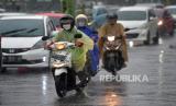 Pengendara menggunakan jas hujan menembus hujan di kawasan Tugu Pal Putih, Yogyakarta, Senin (17/10/2022). BMKG Yogyakarta mengingatkan cuaca ekstrim yang terjadi di Yogyakarta. Potensi terjadi Hujan Sedang-Lebat yang dapat disertai kilat atau petir dan angin kencang akan terjadi dan menghimbau masyarakat mewaspadai cuaca ekstrim ini. (FOTO : Republika/Wihdan Hidayat)