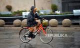 Pesepeda menggunakan jas hujan menembus hujan di kawasan Tugu Pal Putih, Yogyakarta, Senin (17/10/2022). BMKG Yogyakarta mengingatkan cuaca ekstrim yang terjadi di Yogyakarta. Potensi terjadi Hujan Sedang-Lebat yang dapat disertai kilat atau petir dan angin kencang akan terjadi dan menghimbau masyarakat mewaspadai cuaca ekstrim ini. (FOTO : Republika/Wihdan Hidayat)