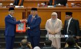 Penjabat (Pj) Gubernur DKI Jakarta Heru Budi Hartono menerima dokumen dari Ketua DPRD DKI Jakarta Prasetyo Edi Marsudi saat rapat paripurna DPRD DKI Jakarta di ruang Rapat Paripurna DPRD DKI Jakarta, Senin (17/10/2022). Pj Gubernur DKI Jakarta Heru Budi Hartono menghadiri rapat paripurna DPRD DKI Jakarta untuk pertama kalinya usai dilantik. Adapun agenda paripurna tersebut yaitu Penyampaian Laporan hasil pembahasan Bapemperda terhadap Raperda tentang pencabutan Peraturan Daerah Nomor 1 Tahun 2014 tentang Rencana Detail Tata Ruang dan Peraturan Zonasi.  (FOTO : Republika/Prayogi)